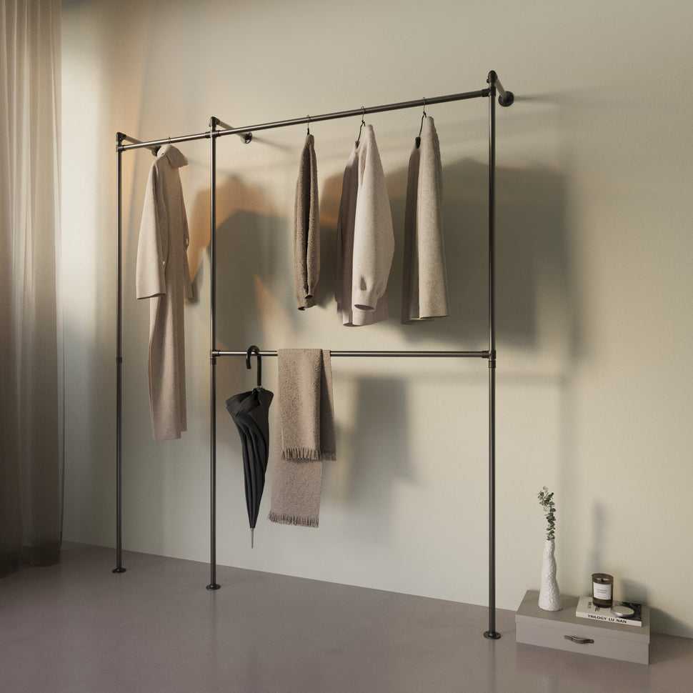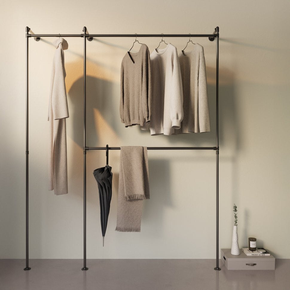 Ons systeem boeit met een duidelijk, industrieel-Scandinavisch ontwerp dat uw garderobe stelt. Met stabiele materialen en flexibele componenten maken we een product dat niet alleen duurzaam is, maar ook individueel aanpasbaar is. Dit geeft u een oplossing die perfect in uw huis past en uw dagelijks leven veel gemakkelijker maakt.