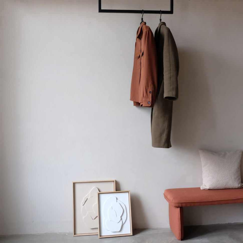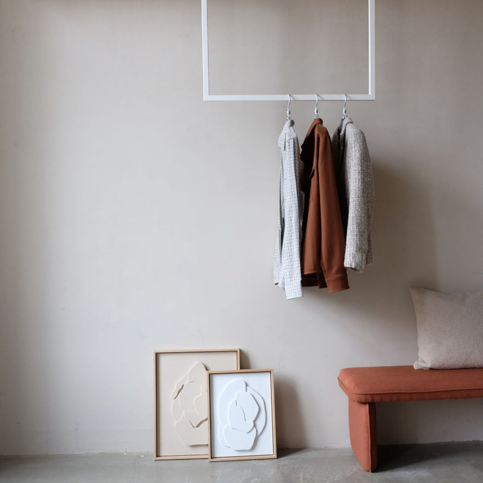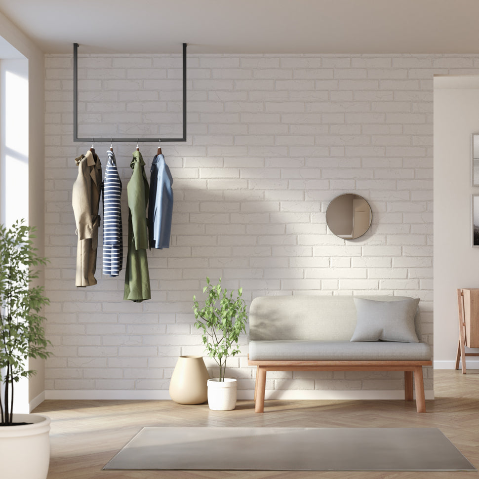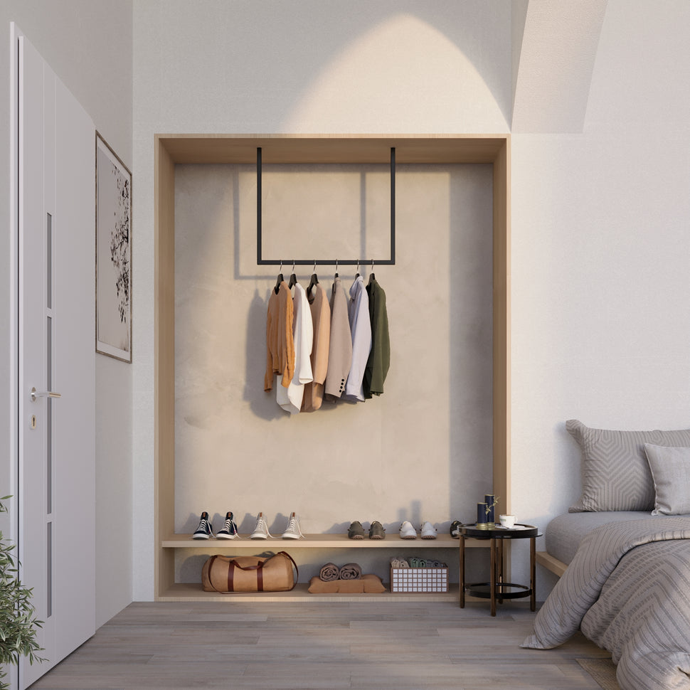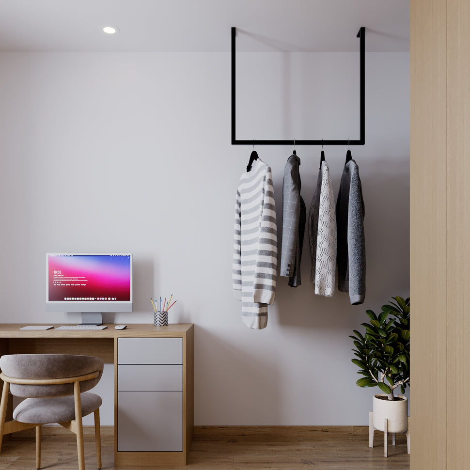 Ben je het zat met kleding en accessoires verdwijnen in verwarrende hoeken? Met de Frame Joey - plafond -geassembleerde kledingrail Wij bieden u een elegante en praktische oplossing die uw garderobe naar het volgende niveau verheft. Onze innovatieve kledingrail is ideaal voor kleine kamers en helpt de vloer gratis te houden - perfect als u duidelijke lijnen en stijlvol ontwerp waardeert.