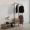 Begehbarer Kleiderschrank aus schwarzen, quadratischen Eisenrohren mit Kleiderstangen für lange und kurze Kleidung und Kommode aus klassischer Eiche
