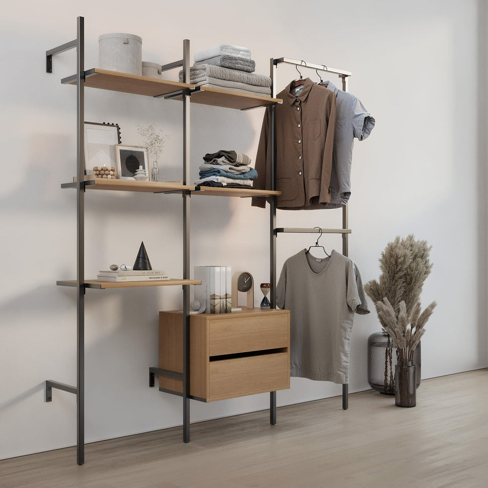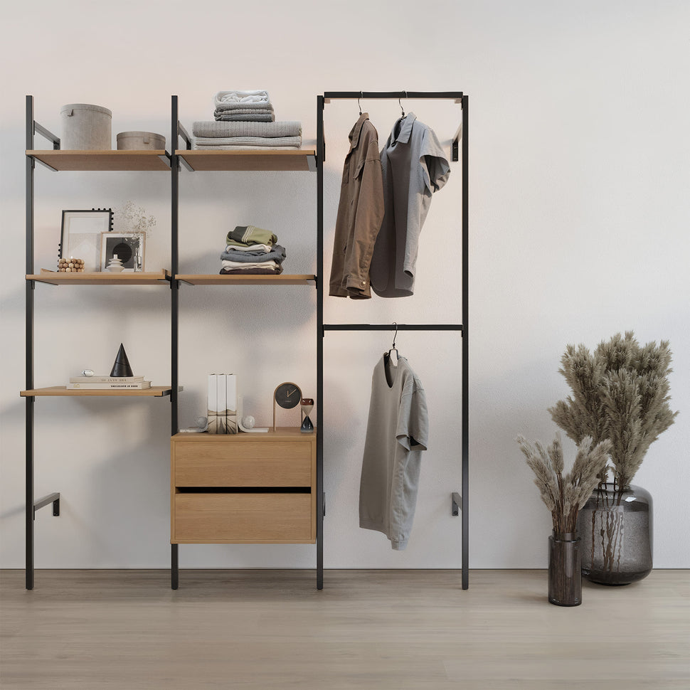 Ons Frame Walk-In 3 rijen kledingrailsysteem - (2 planken + 1 tafel / 2 planken + 1 ladekast / 2 wasstaven) Overtuigd met zijn flexibele aanpassingsopties: