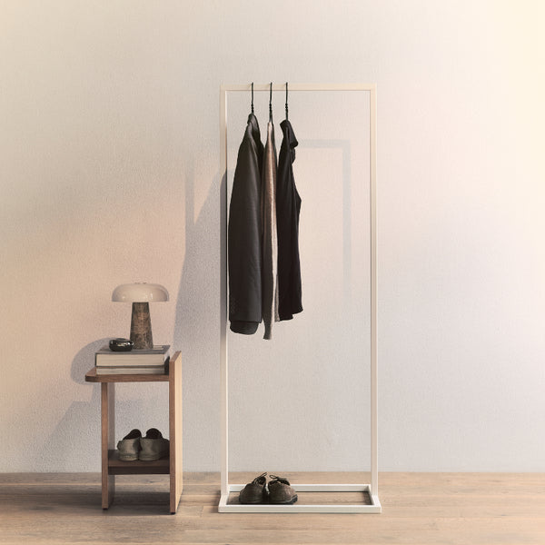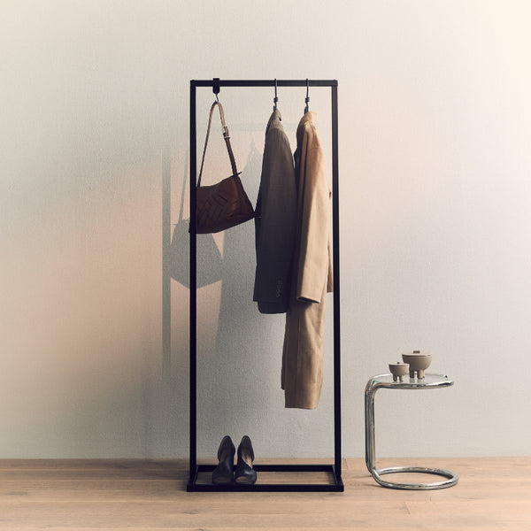 Minder is soms meer. De Frame Collection overtuigd met hun eenvoud en elegantie. Hier staan je kleren op de voorgrond, zodat je jezelf en je kledingstijl volledig kunt ontsteken. De vierkante structuur van de kledingrekken gemaakt van wit en zwart metaal wordt weerspiegeld in de vorm van de pijpen. De hoeken en randen van de leidingen creëren een frame voor uw kleding en sturen een uitzicht op uw sieraden zonder deze af te leiden. Het witte en zwarte metaal van de kledingrails en het kledingrek geeft de producten de noodzakelijke neutraliteit om perfect samen te voegen met elke meubelstijl. Een echte oogstadder die je garderobe opvangt.