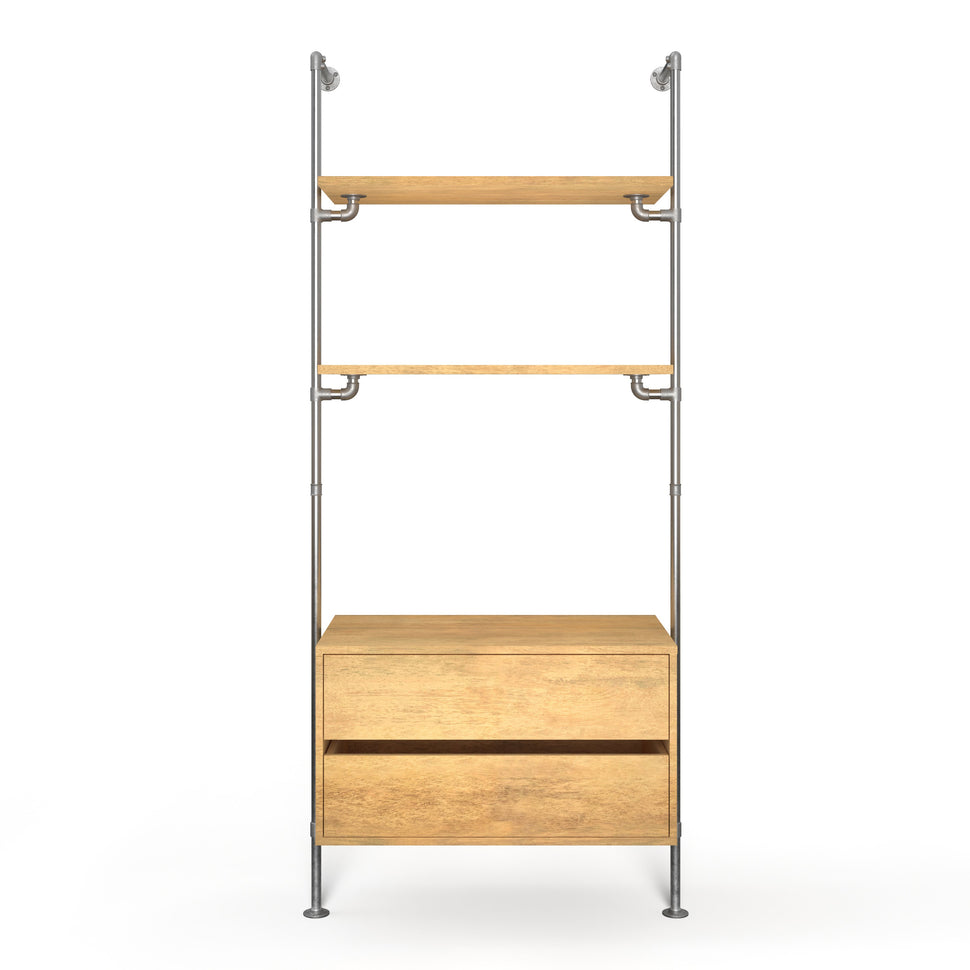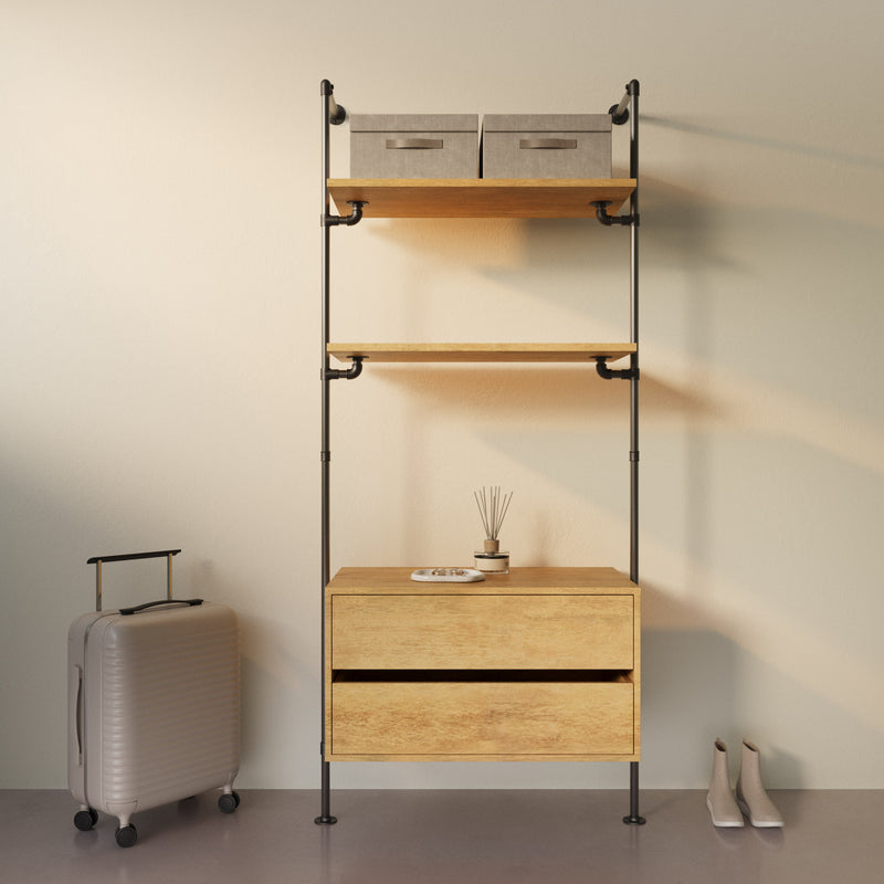 Met De Walk-In Met ladenkast - (2 planken + 1 ladekast) U creëert niet alleen meer opslagruimte, maar zet ook een sterk ontwerpverklaring in uw huis. Het maakt niet uit of u in stedelijke kamers woont als een jonge professional of als een gezin - wij hebben De individuele oplossingDat voldoet aan uw eisen aan stijl, functie en duurzaamheid.