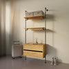 Optimale kamerindeling: Twee planken en een elegante ladekast combineren in een harmonieus systeem dat je huis bestelt en upgrat.