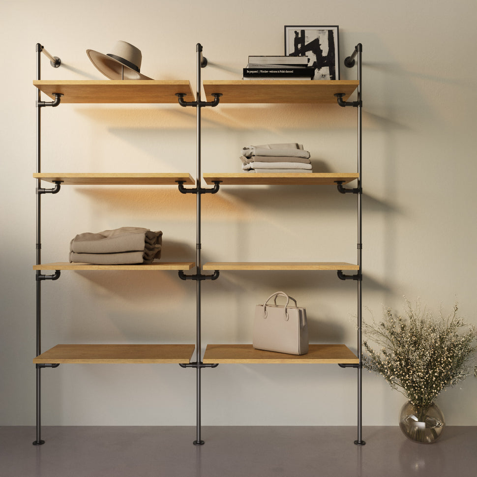 Met de Walk-In 2 rijen kledingrailsysteem - (4 planken / 4 planken) U krijgt een oplossing die niet alleen praktisch is, maar ook uw persoonlijkheid onderstreept. We zijn ervan overtuigd dat ons concept de mogelijkheden van opslagsystemen opnieuw definieert - volgens uw smaak.