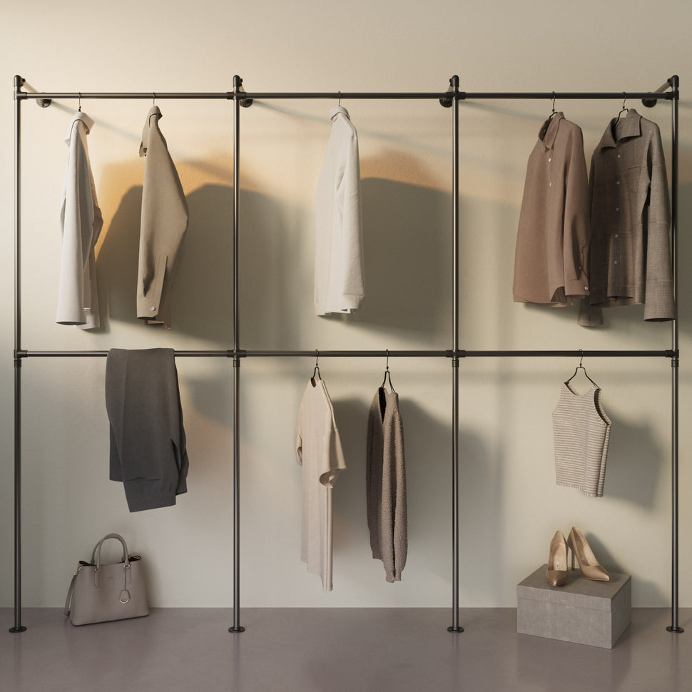 Ons kledingrailsysteem transformeert ongebruikte kamers in echte oases van orde. Met drie rijen, bestaande uit twee wasbars, stellen we u in staat om een individuele en flexibele opslagoplossing te hebben - ideaal voor uw favoriete kleding en accessoires. Profiteren van: