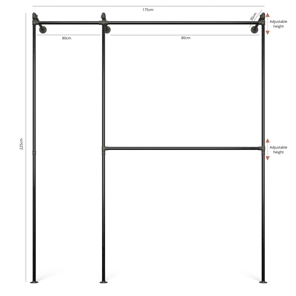 Ons systeem boeit met een duidelijk, industrieel-Scandinavisch ontwerp dat uw garderobe stelt. Met stabiele materialen en flexibele componenten maken we een product dat niet alleen duurzaam is, maar ook individueel aanpasbaar is. Dit geeft u een oplossing die perfect in uw huis past en uw dagelijks leven veel gemakkelijker maakt.