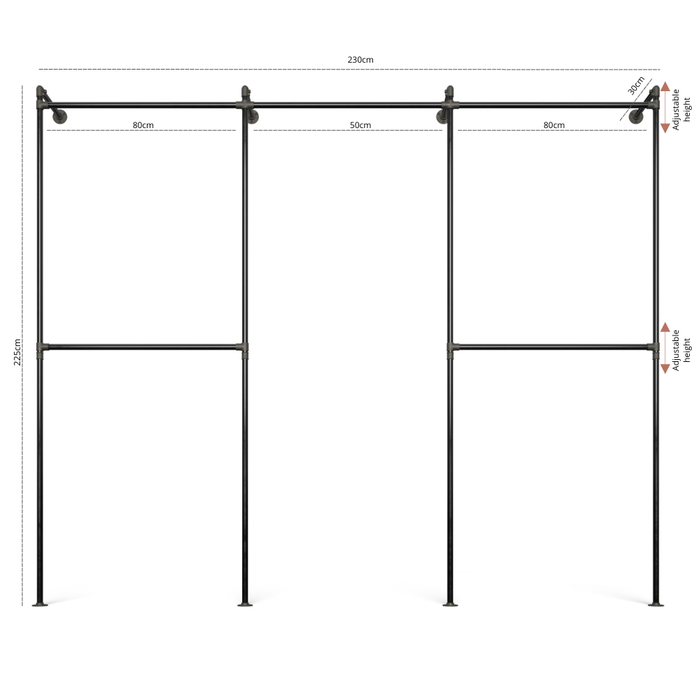 Als u bijvoorbeeld 80 cm/80 cm/80 cm kiest, is het kledingrek ongeveer. 260 cm breed.
