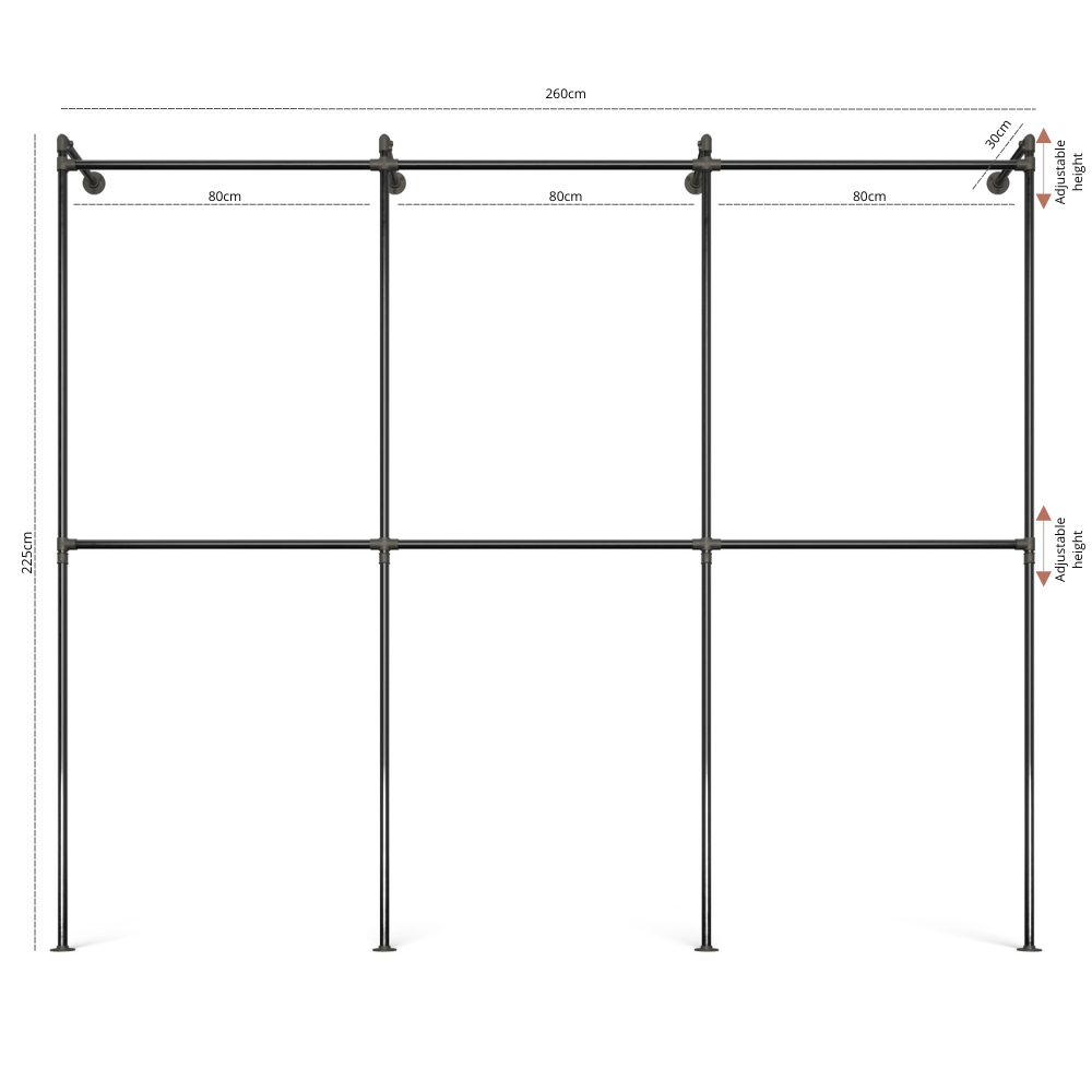 Als u bijvoorbeeld 80 cm/80 cm/80 cm kiest, is het kledingrek ongeveer. 260 cm breed.