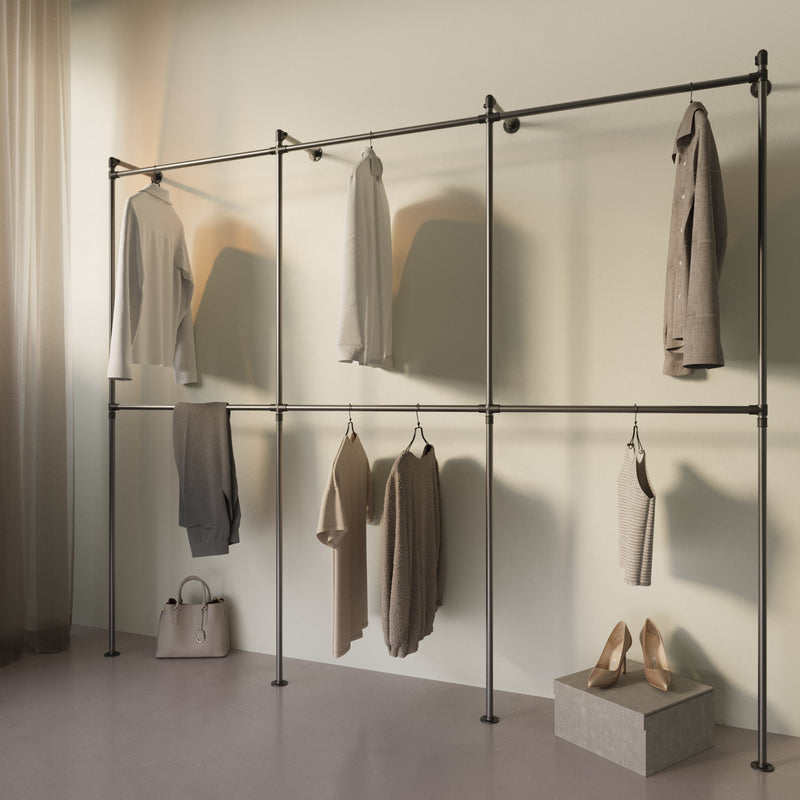 Ons kledingrailsysteem transformeert ongebruikte kamers in echte oases van orde. Met drie rijen, bestaande uit twee wasbars, stellen we u in staat om een individuele en flexibele opslagoplossing te hebben - ideaal voor uw favoriete kleding en accessoires. Profiteren van: