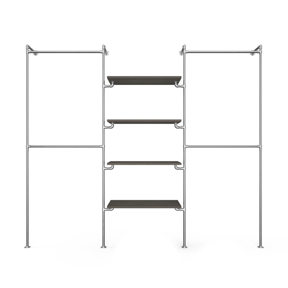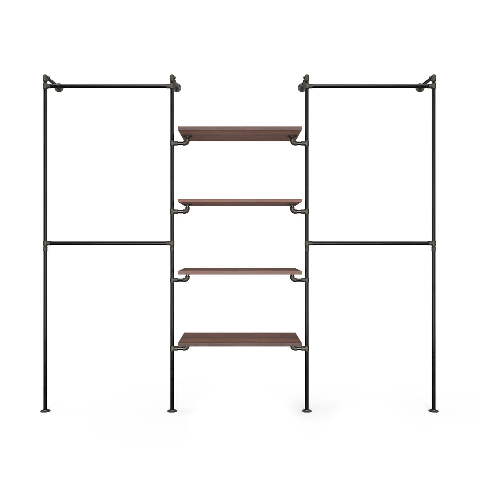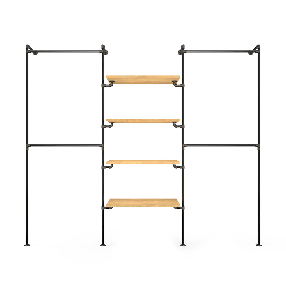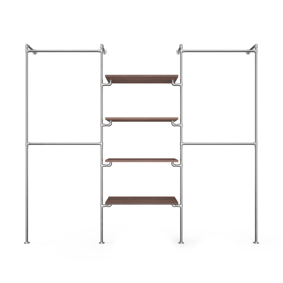 Dit ontwerp van de Walk-In Collection Hiermee kunt u uw kleding op twee niveaus in de buitenste compartimenten hangen. Gebruik de high -height -verstelbare houten planken in het midden voor schoenen, tassen, dozen of iets anders dat niet in je open garderobe mogen ontbreken. U kunt de planken gebruiken om uw favoriete schoenen te presenteren of om persoonlijke objecten zoals foto's, boeken en planten op te slaan.