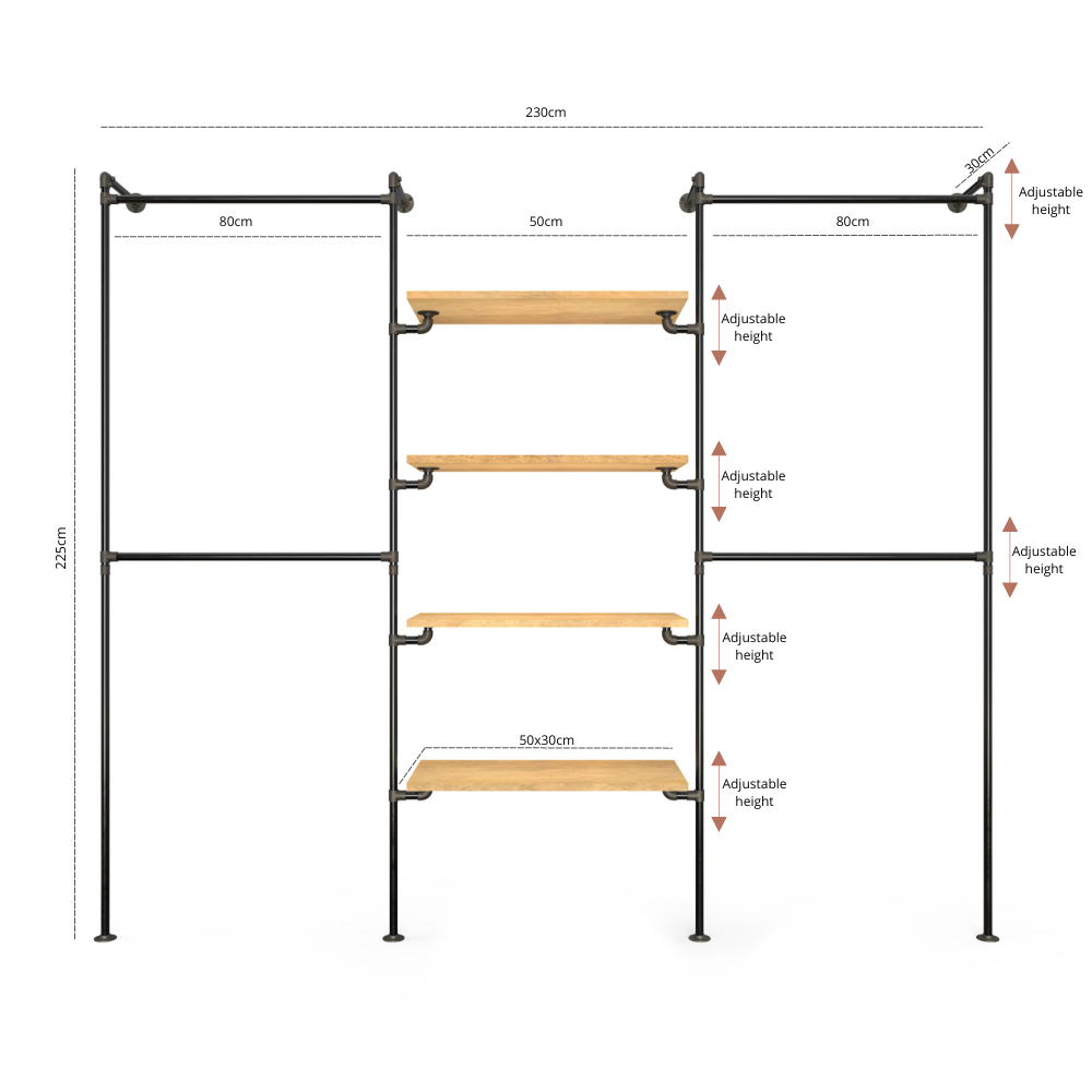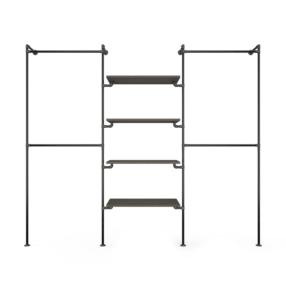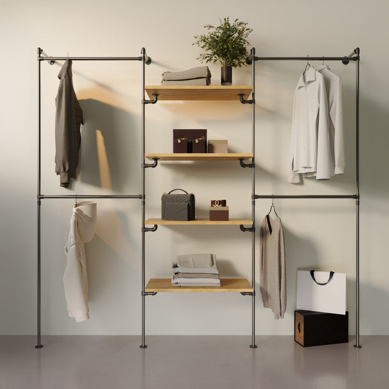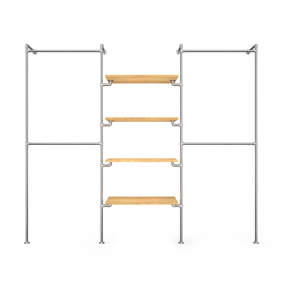 Dit ontwerp van de Walk-In Collection Hiermee kunt u uw kleding op twee niveaus in de buitenste compartimenten hangen. Gebruik de high -height -verstelbare houten planken in het midden voor schoenen, tassen, dozen of iets anders dat niet in je open garderobe mogen ontbreken. U kunt de planken gebruiken om uw favoriete schoenen te presenteren of om persoonlijke objecten zoals foto's, boeken en planten op te slaan.