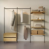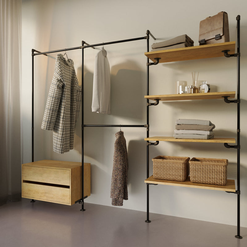 Met De Walk-In Met ladenkast - (1 staaf + 1 ladekast / 2 polen / 4 planken) Van Rackbuddy transformeert u elke garderobe in een kamer die al uw wensen vervult. De combinatie van elegante waterleidingen en warme houten oppervlakken zorgt voor een minimalistisch, Scandinavisch ontwerp dat perfect past bij moderne levende concepten.